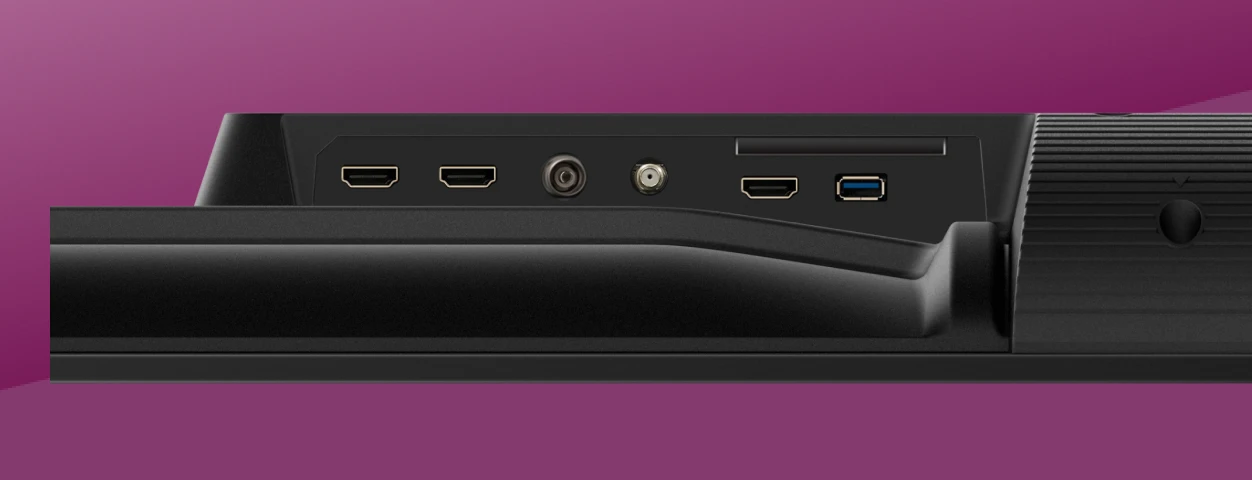Aan de zijkant van het scherm vind je de volgende aansluitingen: 3x HDMI 2.1 eARC, USB 3.0, RF kabel, RF satelliet, CI slot.